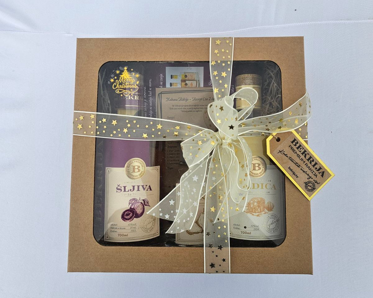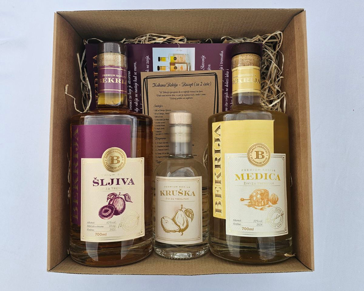 Sadrži dvije velike boce naših najnagrađivanijih destilata: šampionsku Šljivovicu i aromatičnu Medicu, uz dodatak elegantne Viljamovke u 0,2 L pakiranju.